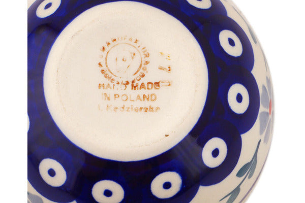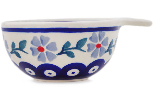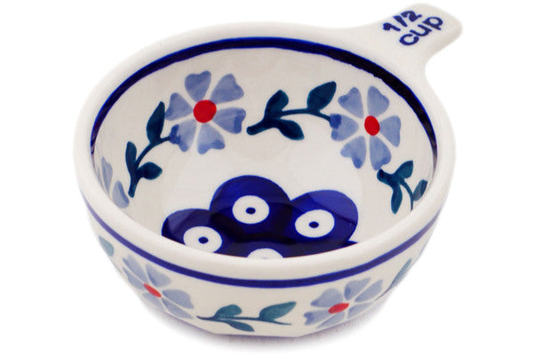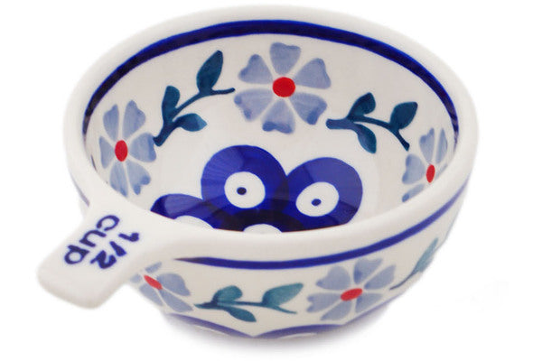 This Peacock Forget-Me-Not 4 oz 1/2 Cup Measuring Cup was handmade and hand decorated in Boleslawiec, Poland by skilled artisans according to old traditional methods. This Polish stoneware is microwave, dishwasher, freezer, and oven safe up to 480°F. It does not contain lead or cadmium. It is part of the Peacock Forget-Me-Not Collection.
