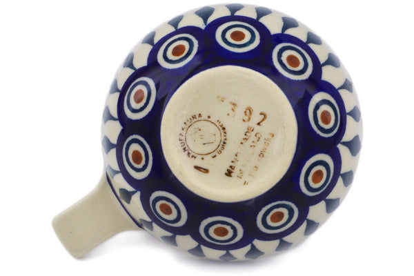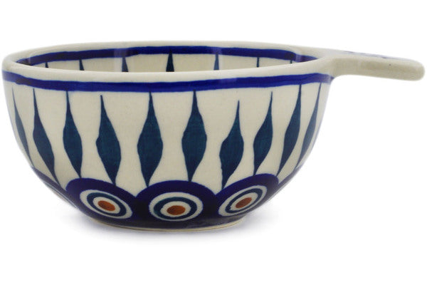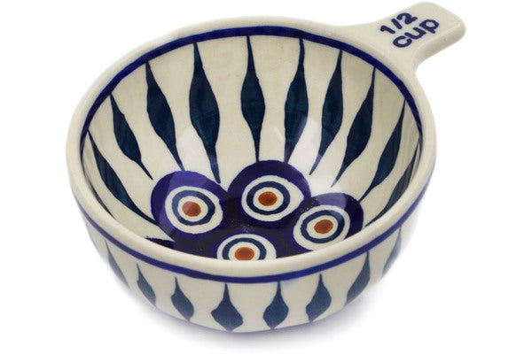 This Peacock 4 oz 1/2 Cup Measuring Cup was handmade and hand decorated in Boleslawiec, Poland by skilled artisans according to old traditional methods. This Polish stoneware is microwave, dishwasher, freezer, and oven safe up to 480°F. It does not contain lead or cadmium. It is part of the Peacock Collection.