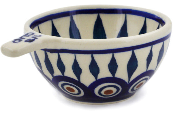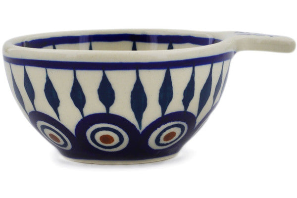 This Peacock 2 oz 1/3 Cup Measuring Cup was handmade and hand decorated in Boleslawiec, Poland by skilled artisans according to old traditional methods. This Polish stoneware is microwave, dishwasher, freezer, and oven safe up to 480°F. It does not contain lead or cadmium. It is part of the Peacock Collection.