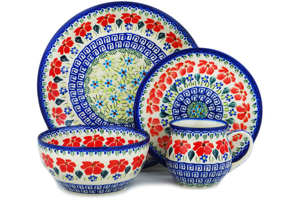 This Grecian Fields 4-Piece Place Setting was handmade and hand decorated in Boleslawiec, Poland by skilled artisans according to old traditional methods. This Polish stoneware is microwave, dishwasher, freezer, and oven safe up to 480°F. It does not contain lead or cadmium. It is part of the Grecian Fields Collection.