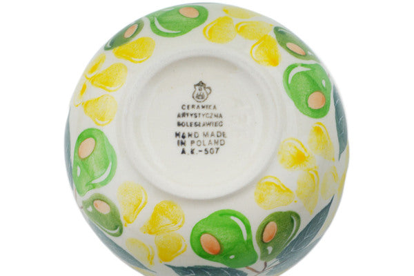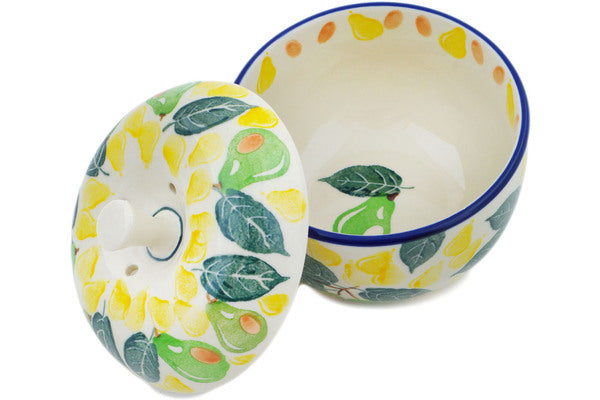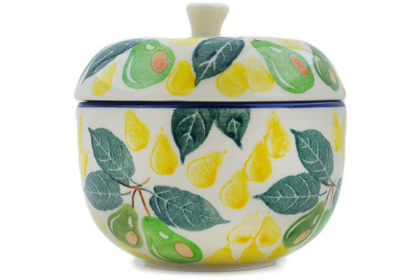 This Fresh Pear 4" Apple Shaped Jar was handmade and hand decorated in Boleslawiec, Poland by skilled artisans according to old traditional methods. This Polish stoneware is microwave, dishwasher, freezer, and oven safe up to 480°F. It does not contain lead or cadmium. It is part of the Fresh Pear Collection.