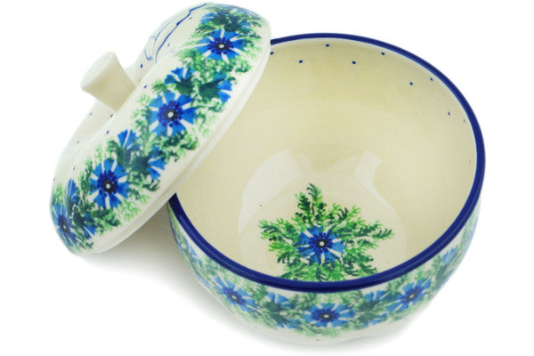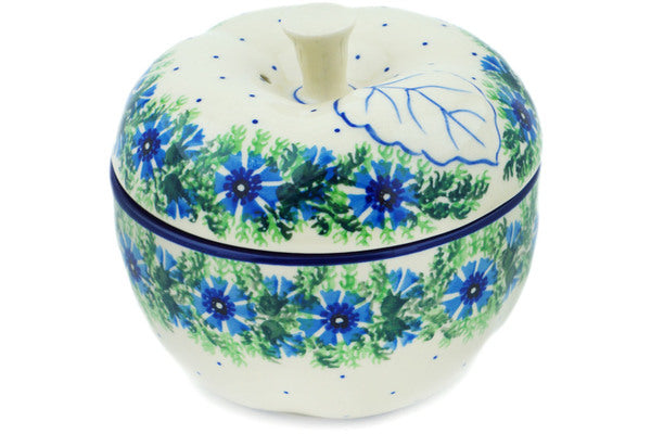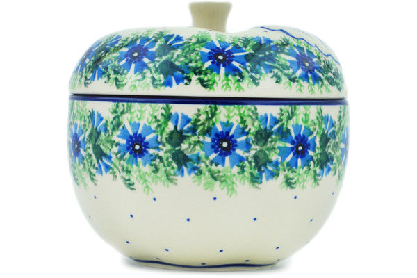 This Blue Bell Wreath 5" Apple Shaped Jar was handmade and hand decorated in Boleslawiec, Poland by skilled artisans according to old traditional methods. This Polish stoneware is microwave, dishwasher, freezer, and oven safe up to 480°F. It does not contain lead or cadmium. It is part of the Blue Bell Wreath Collection.