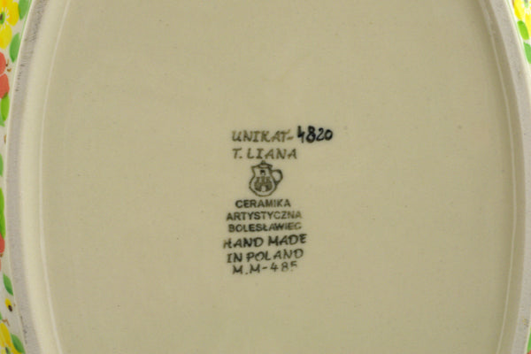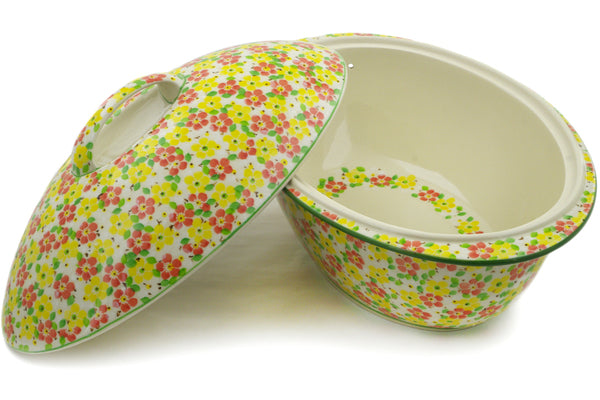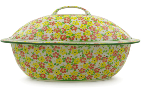 This Fertile Meadow 16" Baker with Cover was handmade and hand decorated in Boleslawiec, Poland by skilled artisans according to old traditional methods. This is a Polish pottery Signature Unikat, which means that it has been hand painted with both sponges and brushes and it is signed by the artist who painted it. Unikat pieces are the most intricate works of art. Larger Unikat items take hours of very careful work to finish. This Polish stoneware is microwave, dishwasher, freezer, and oven safe up to 480°F. It does not contain lead or cadmium. It is part of the Fertile Meadow Collection.