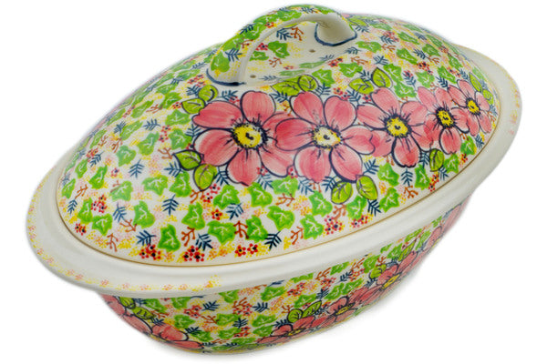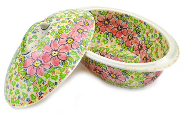 This Wild Peonies 16" Baker with Cover was handmade and hand decorated in Boleslawiec, Poland by skilled artisans according to old traditional methods. This is a Polish pottery Signature Unikat, which means that it has been hand painted with both sponges and brushes and it is signed by the artist who painted it. Unikat pieces are the most intricate works of art. Larger Unikat items take hours of very careful work to finish. This Polish stoneware is microwave, dishwasher, freezer, and oven safe up to 480°F. It does not contain lead or cadmium. It is part of the Wild Peonies Collection.