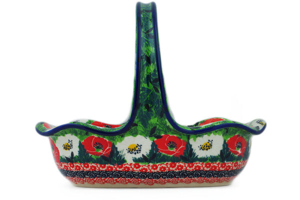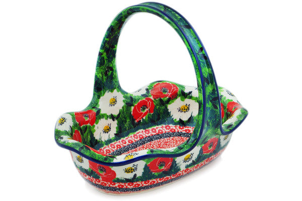 This Polish Summer 8" Basket with Handle was handmade and hand decorated in Boleslawiec, Poland by skilled artisans according to old traditional methods. This is a Polish pottery Signature Unikat, which means that it has been hand painted with both sponges and brushes and it is signed by the artist who painted it. Unikat pieces are the most intricate works of art. Larger Unikat items take hours of very careful work to finish. This Polish stoneware is microwave, dishwasher, freezer, and oven safe up to 480°F. It does not contain lead or cadmium. It is part of the Polish Summer Collection.