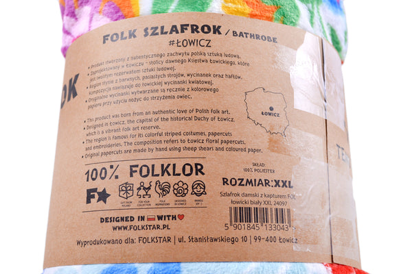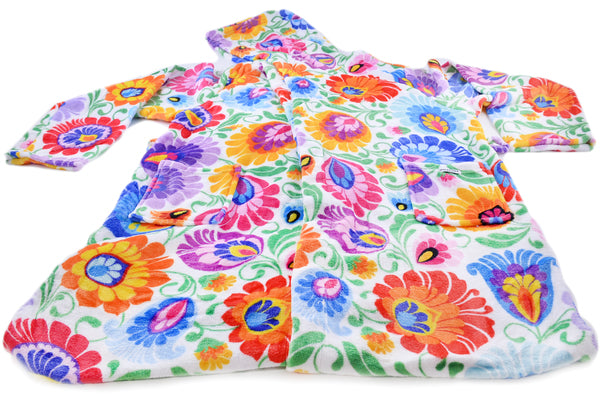 This White Folk 58" Bathrobe size XXL was handmade and hand decorated in Boleslawiec, Poland by skilled artisans according to old traditional methods. This Polish stoneware is microwave, dishwasher, freezer, and oven safe up to 480°F. It does not contain lead or cadmium. It is part of the White Folk Collection.