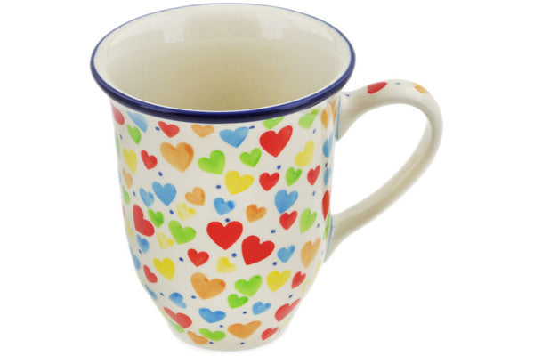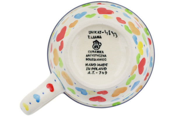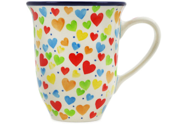 This In Love With Love 17 oz Bistro Mug was handmade and hand decorated in Boleslawiec, Poland by skilled artisans according to old traditional methods. This is a Polish pottery Signature Unikat, which means that it has been hand painted with both sponges and brushes and it is signed by the artist who painted it. Unikat pieces are the most intricate works of art. Larger Unikat items take hours of very careful work to finish. This Polish stoneware is microwave, dishwasher, freezer, and oven safe up to 480°F. It does not contain lead or cadmium. It is part of the In Love With Love Collection.