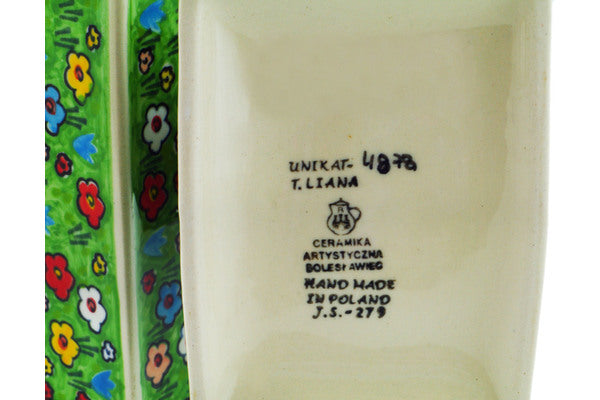 This Whimsical Garden 9" Book Stand was handmade and hand decorated in Boleslawiec, Poland by skilled artisans according to old traditional methods. This is a Polish pottery Signature Unikat, which means that it has been hand painted with both sponges and brushes and it is signed by the artist who painted it. Unikat pieces are the most intricate works of art. Larger Unikat items take hours of very careful work to finish. This Polish stoneware is microwave, dishwasher, freezer, and oven safe up to 480°F. It does not contain lead or cadmium. It is part of the Whimsical Garden Collection.