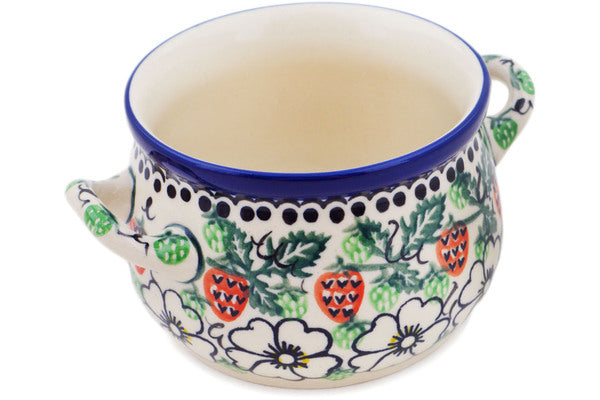 This Strawberries And Cream 12 oz Bouillon Cup was handmade and hand decorated in Boleslawiec, Poland by skilled artisans according to old traditional methods. This is a Polish pottery Signature Unikat, which means that it has been hand painted with both sponges and brushes and it is signed by the artist who painted it. Unikat pieces are the most intricate works of art. Larger Unikat items take hours of very careful work to finish. This Polish stoneware is microwave, dishwasher, freezer, and oven safe up to 480°F. It does not contain lead or cadmium. It is part of the Strawberries And Cream Collection.