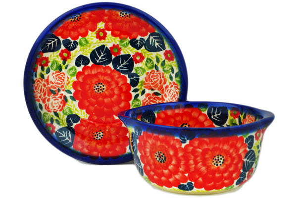 This Radiant Red Garden 5 oz Bouillon Cup with Saucer was handmade and hand decorated in Boleslawiec, Poland by skilled artisans according to old traditional methods. This is a Polish pottery Signature Unikat, which means that it has been hand painted with both sponges and brushes and it is signed by the artist who painted it. Unikat pieces are the most intricate works of art. Larger Unikat items take hours of very careful work to finish. This Polish stoneware is microwave, dishwasher, freezer, and oven safe up to 480°F. It does not contain lead or cadmium. It is part of the Radiant Red Garden Collection.