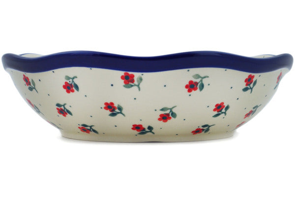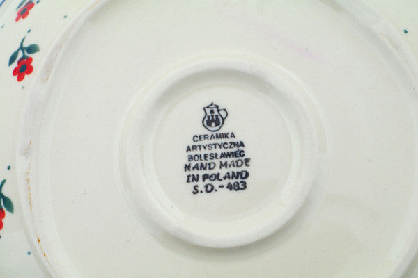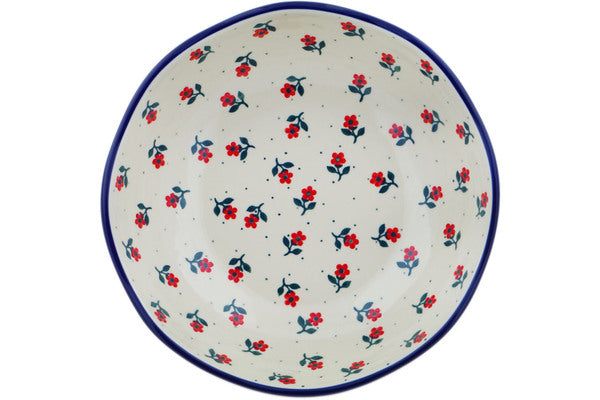 This Auntie Em Scarlet 10" Scalloped Bowl was handmade and hand decorated in Boleslawiec, Poland by skilled artisans according to old traditional methods. This Polish stoneware is microwave, dishwasher, freezer, and oven safe up to 480°F. It does not contain lead or cadmium. It is part of the Auntie Em Scarlet Collection.