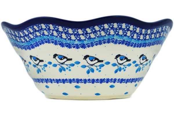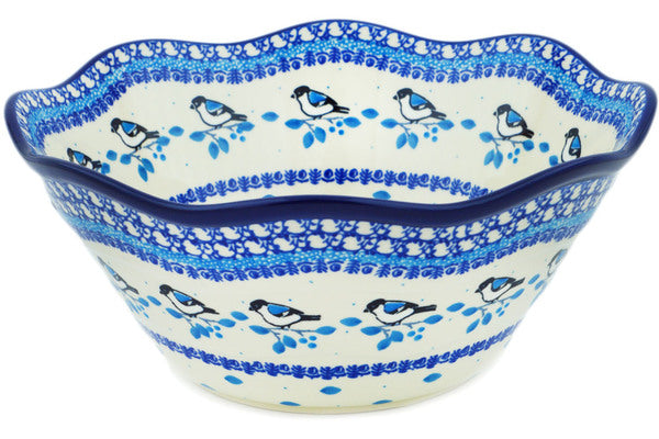 This Winter Sparrow 10" Scalloped Bowl was handmade and hand decorated in Boleslawiec, Poland by skilled artisans according to old traditional methods. This Polish stoneware is microwave, dishwasher, freezer, and oven safe up to 480°F. It does not contain lead or cadmium. It is part of the Winter Sparrow Collection.