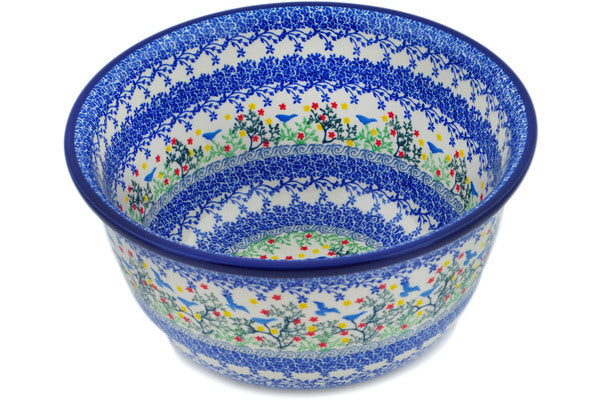 This Free Flock 11" Bowl was handmade and hand decorated in Boleslawiec, Poland by skilled artisans according to old traditional methods. This is a Polish pottery Signature Unikat, which means that it has been hand painted with both sponges and brushes and it is signed by the artist who painted it. Unikat pieces are the most intricate works of art. Larger Unikat items take hours of very careful work to finish. This Polish stoneware is microwave, dishwasher, freezer, and oven safe up to 480°F. It does not contain lead or cadmium. It is part of the Free Flock Collection.