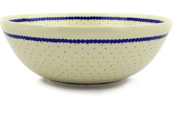 This Blue Polka Dot 13" Bowl was handmade and hand decorated in Boleslawiec, Poland by skilled artisans according to old traditional methods. This Polish stoneware is microwave, dishwasher, freezer, and oven safe up to 480°F. It does not contain lead or cadmium. It is part of the Blue Polka Dot Collection.
