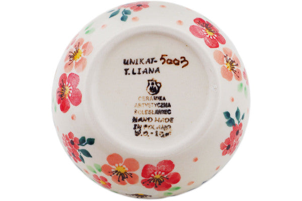 This Pink Divinity 3" Bowl was handmade and hand decorated in Boleslawiec, Poland by skilled artisans according to old traditional methods. This is a Polish pottery Signature Unikat, which means that it has been hand painted with both sponges and brushes and it is signed by the artist who painted it. Unikat pieces are the most intricate works of art. Larger Unikat items take hours of very careful work to finish. This Polish stoneware is microwave, dishwasher, freezer, and oven safe up to 480°F. It does not contain lead or cadmium. It is part of the Pink Divinity Collection.