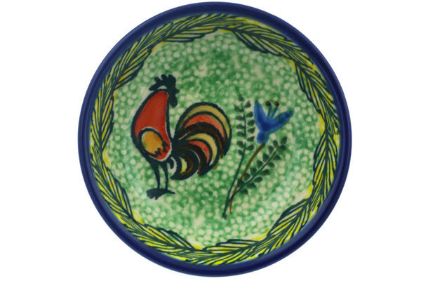 This Rooster Parade 3" Bowl was handmade and hand decorated in Boleslawiec, Poland by skilled artisans according to old traditional methods. This is a Polish pottery Signature Unikat, which means that it has been hand painted with both sponges and brushes and it is signed by the artist who painted it. Unikat pieces are the most intricate works of art. Larger Unikat items take hours of very careful work to finish. This Polish stoneware is microwave, dishwasher, freezer, and oven safe up to 480°F. It does not contain lead or cadmium. It is part of the Rooster Parade Collection.