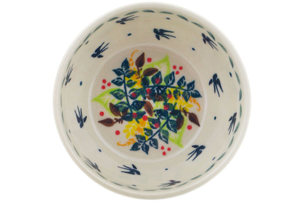 This Sunny Swallow 4" Bowl was handmade and hand decorated in Boleslawiec, Poland by skilled artisans according to old traditional methods. This is a Polish pottery Signature Unikat, which means that it has been hand painted with both sponges and brushes and it is signed by the artist who painted it. Unikat pieces are the most intricate works of art. Larger Unikat items take hours of very careful work to finish. This Polish stoneware is microwave, dishwasher, freezer, and oven safe up to 480°F. It does not contain lead or cadmium. It is part of the Sunny Swallow Collection.