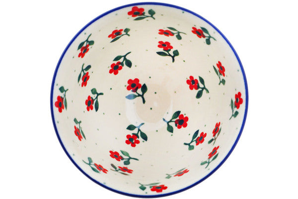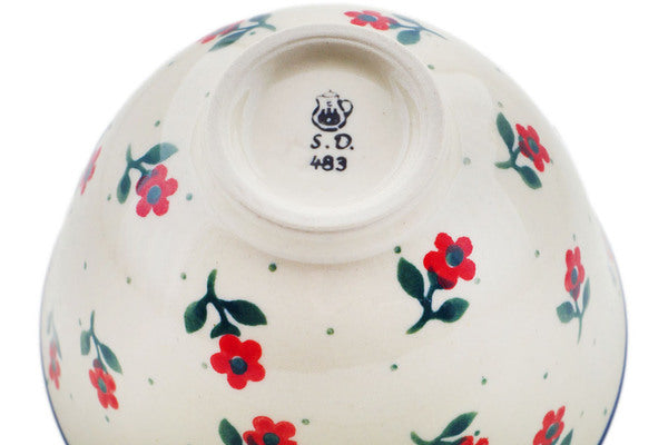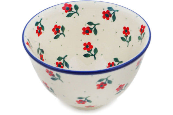 This Auntie Em Scarlet 5" Bowl with Pedestal was handmade and hand decorated in Boleslawiec, Poland by skilled artisans according to old traditional methods. This Polish stoneware is microwave, dishwasher, freezer, and oven safe up to 480°F. It does not contain lead or cadmium. It is part of the Auntie Em Scarlet Collection.