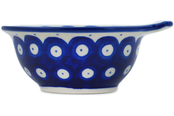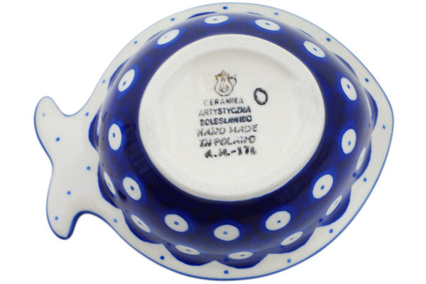This Bleeding Heart Peacock 5" Fish Shaped Bowl was handmade and hand decorated in Boleslawiec, Poland by skilled artisans according to old traditional methods. This Polish stoneware is microwave, dishwasher, freezer, and oven safe up to 480°F. It does not contain lead or cadmium. It is part of the Bleeding Heart Peacock Collection.