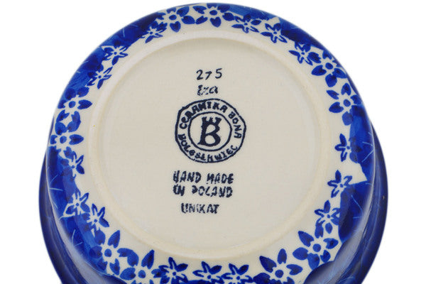 This Divine Cobalt 5" Bowl was handmade and hand decorated in Boleslawiec, Poland by skilled artisans according to old traditional methods. This is a Polish pottery Signature Unikat, which means that it has been hand painted with both sponges and brushes and it is signed by the artist who painted it. Unikat pieces are the most intricate works of art. Larger Unikat items take hours of very careful work to finish. This Polish stoneware is microwave, dishwasher, freezer, and oven safe up to 480°F. It does not contain lead or cadmium. It is part of the Divine Cobalt Collection.