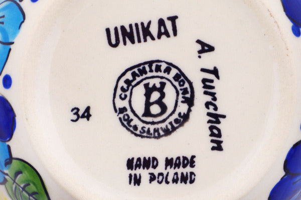 This Endless Summer 5" Bowl was handmade and hand decorated in Boleslawiec, Poland by skilled artisans according to old traditional methods. This is a Polish pottery Signature Unikat, which means that it has been hand painted with both sponges and brushes and it is signed by the artist who painted it. Unikat pieces are the most intricate works of art. Larger Unikat items take hours of very careful work to finish. This Polish stoneware is microwave, dishwasher, freezer, and oven safe up to 480°F. It does not contain lead or cadmium. It is part of the Endless Summer Collection.