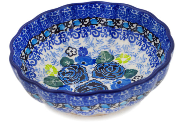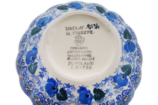 This Garden At Midnight 5" Scalloped Fluted Bowl was handmade and hand decorated in Boleslawiec, Poland by skilled artisans according to old traditional methods. This is a Polish pottery Signature Unikat, which means that it has been hand painted with both sponges and brushes and it is signed by the artist who painted it. Unikat pieces are the most intricate works of art. Larger Unikat items take hours of very careful work to finish. This Polish stoneware is microwave, dishwasher, freezer, and oven safe up to 480°F. It does not contain lead or cadmium. It is part of the Garden At Midnight Collection.