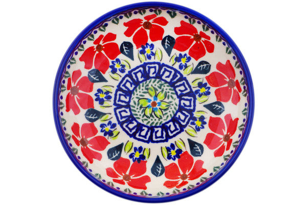 This Grecian Fields 5" Bowl was handmade and hand decorated in Boleslawiec, Poland by skilled artisans according to old traditional methods. This Polish stoneware is microwave, dishwasher, freezer, and oven safe up to 480°F. It does not contain lead or cadmium. It is part of the Grecian Fields Collection.