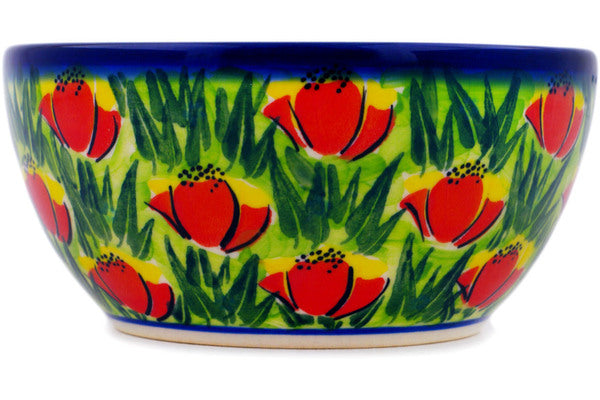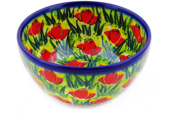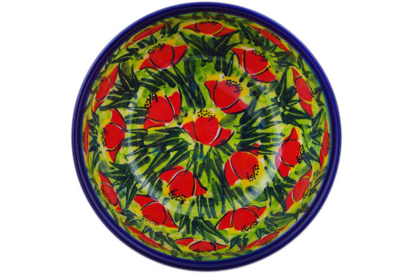 This Poppy Fever 5" Bowl was handmade and hand decorated in Boleslawiec, Poland by skilled artisans according to old traditional methods. This is a Polish pottery Signature Unikat, which means that it has been hand painted with both sponges and brushes and it is signed by the artist who painted it. Unikat pieces are the most intricate works of art. Larger Unikat items take hours of very careful work to finish. This Polish stoneware is microwave, dishwasher, freezer, and oven safe up to 480°F. It does not contain lead or cadmium. It is part of the Poppy Fever Collection.