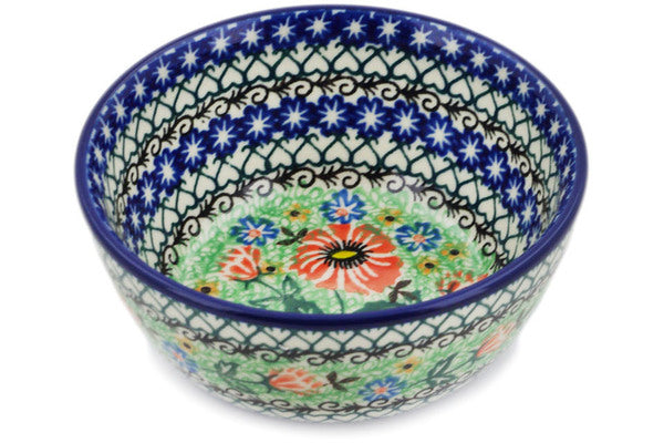 This Poppy Parade 5" Bowl was handmade and hand decorated in Boleslawiec, Poland by skilled artisans according to old traditional methods. This is a Polish pottery Signature Unikat, which means that it has been hand painted with both sponges and brushes and it is signed by the artist who painted it. Unikat pieces are the most intricate works of art. Larger Unikat items take hours of very careful work to finish. This Polish stoneware is microwave, dishwasher, freezer, and oven safe up to 480°F. It does not contain lead or cadmium. It is part of the Poppy Parade Collection.