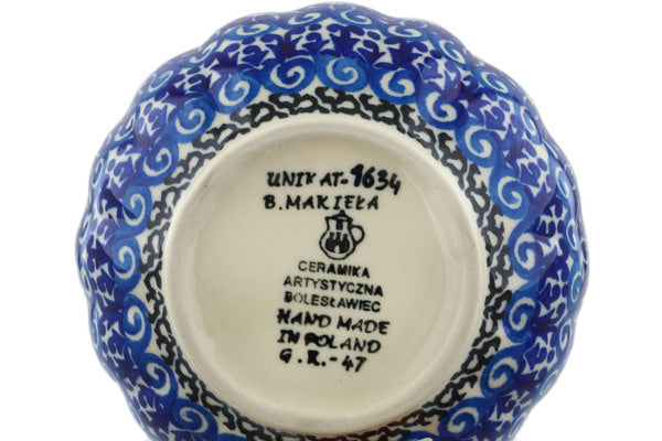 This Snowmen Circle 5" Scalloped Fluted Bowl was handmade and hand decorated in Boleslawiec, Poland by skilled artisans according to old traditional methods. This is a Polish pottery Signature Unikat, which means that it has been hand painted with both sponges and brushes and it is signed by the artist who painted it. Unikat pieces are the most intricate works of art. Larger Unikat items take hours of very careful work to finish. This Polish stoneware is microwave, dishwasher, freezer, and oven safe up to 480°F. It does not contain lead or cadmium. It is part of the Snowmen Circle Collection.