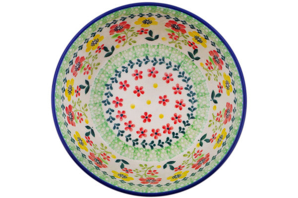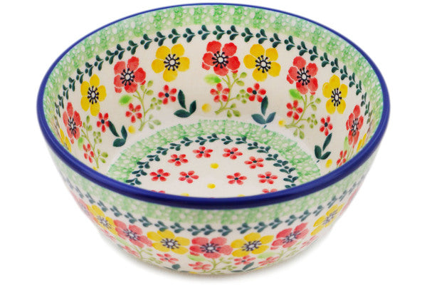 This Spring Bliss 5" Bowl was handmade and hand decorated in Boleslawiec, Poland by skilled artisans according to old traditional methods. This is a Polish pottery Signature Unikat, which means that it has been hand painted with both sponges and brushes and it is signed by the artist who painted it. Unikat pieces are the most intricate works of art. Larger Unikat items take hours of very careful work to finish. This Polish stoneware is microwave, dishwasher, freezer, and oven safe up to 480°F. It does not contain lead or cadmium. It is part of the Spring Bliss Collection.
