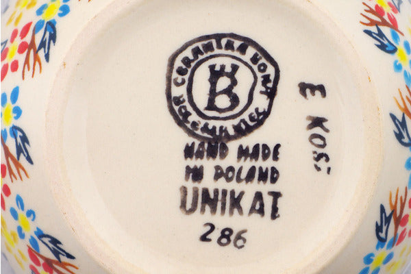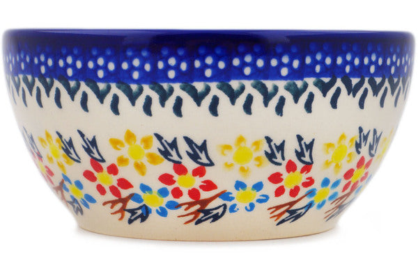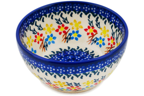 This Spring Flower Ring 4" Bowl was handmade and hand decorated in Boleslawiec, Poland by skilled artisans according to old traditional methods. This Polish stoneware is microwave, dishwasher, freezer, and oven safe up to 480°F. It does not contain lead or cadmium. It is part of the Spring Flower Ring Collection.