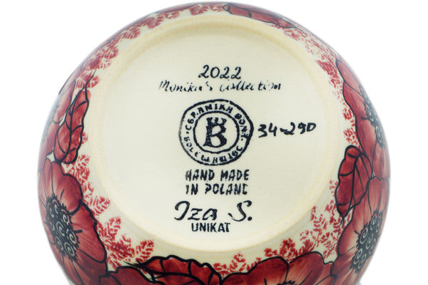 This Sugar Plum Poppies 5" Bowl was handmade and hand decorated in Boleslawiec, Poland by skilled artisans according to old traditional methods. This is a Polish pottery Signature Unikat, which means that it has been hand painted with both sponges and brushes and it is signed by the artist who painted it. Unikat pieces are the most intricate works of art. Larger Unikat items take hours of very careful work to finish. This Polish stoneware is microwave, dishwasher, freezer, and oven safe up to 480°F. It does not contain lead or cadmium. It is part of the Sugar Plum Poppies Collection.