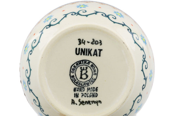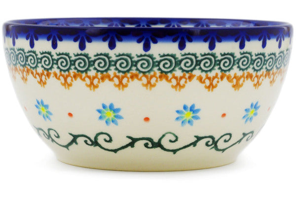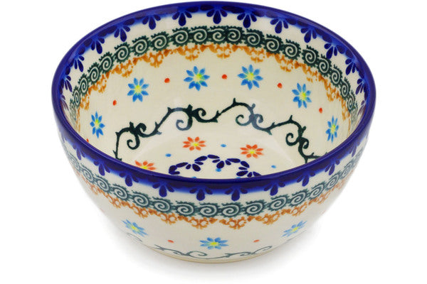 This Sunflower Dance 5" Bowl was handmade and hand decorated in Boleslawiec, Poland by skilled artisans according to old traditional methods. This Polish stoneware is microwave, dishwasher, freezer, and oven safe up to 480°F. It does not contain lead or cadmium. It is part of the Sunflower Dance Collection.