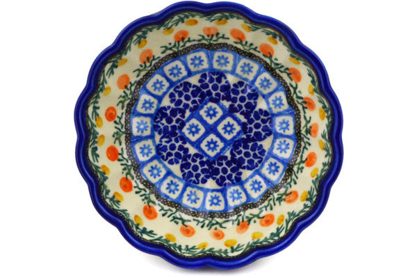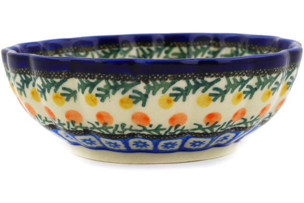 This Winter Forest 5" Scalloped Fluted Bowl was handmade and hand decorated in Boleslawiec, Poland by skilled artisans according to old traditional methods. This is a Polish pottery Signature Unikat, which means that it has been hand painted with both sponges and brushes and it is signed by the artist who painted it. Unikat pieces are the most intricate works of art. Larger Unikat items take hours of very careful work to finish. This Polish stoneware is microwave, dishwasher, freezer, and oven safe up to 480°F. It does not contain lead or cadmium. It is part of the Winter Forest Collection.