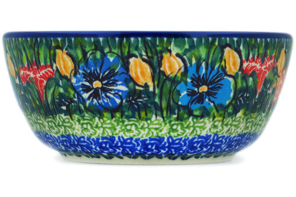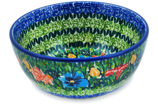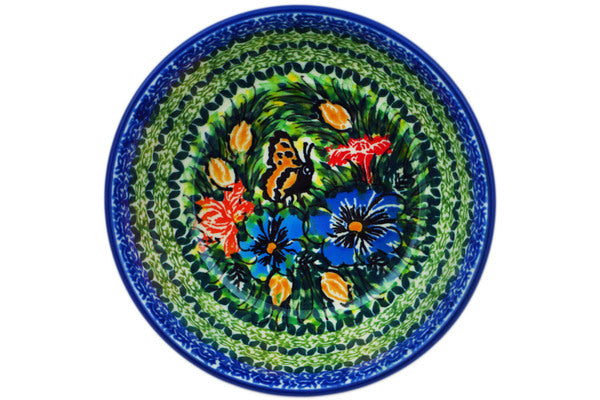This Yellow Butterfly Pond 5" Bowl was handmade and hand decorated in Boleslawiec, Poland by skilled artisans according to old traditional methods. This is a Polish pottery Signature Unikat, which means that it has been hand painted with both sponges and brushes and it is signed by the artist who painted it. Unikat pieces are the most intricate works of art. Larger Unikat items take hours of very careful work to finish. This Polish stoneware is microwave, dishwasher, freezer, and oven safe up to 480°F. It does not contain lead or cadmium. It is part of the Yellow Butterfly Pond Collection.