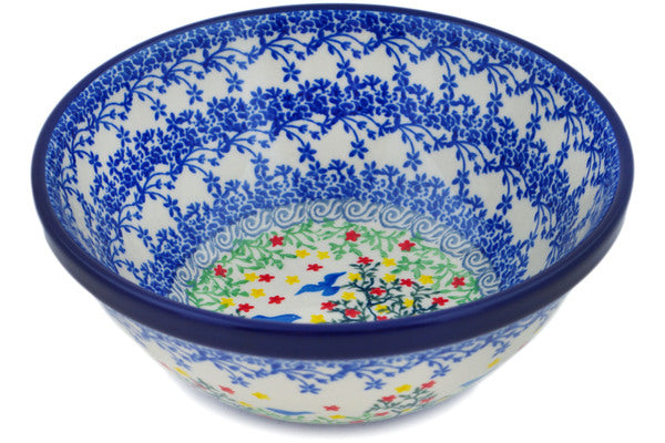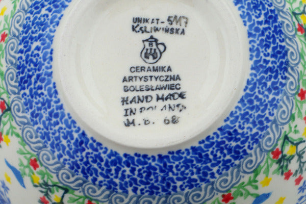 This Free Flock 6" Bowl was handmade and hand decorated in Boleslawiec, Poland by skilled artisans according to old traditional methods. This is a Polish pottery Signature Unikat, which means that it has been hand painted with both sponges and brushes and it is signed by the artist who painted it. Unikat pieces are the most intricate works of art. Larger Unikat items take hours of very careful work to finish. This Polish stoneware is microwave, dishwasher, freezer, and oven safe up to 480°F. It does not contain lead or cadmium. It is part of the Free Flock Collection.