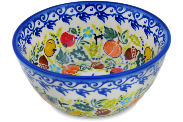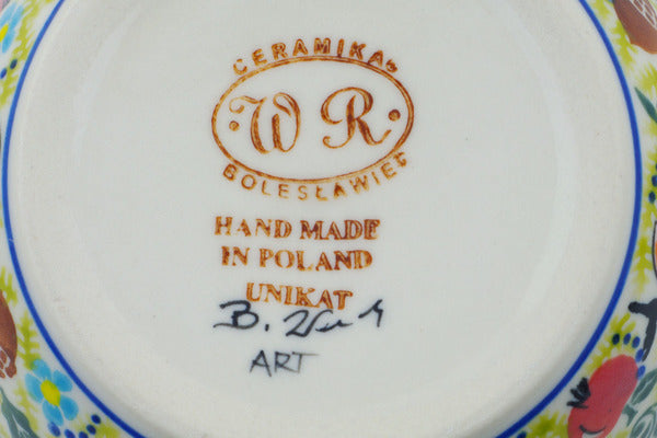This Fruitful Vines 6" Bowl was handmade and hand decorated in Boleslawiec, Poland by skilled artisans according to old traditional methods. This is a Polish pottery Signature Unikat, which means that it has been hand painted with both sponges and brushes and it is signed by the artist who painted it. Unikat pieces are the most intricate works of art. Larger Unikat items take hours of very careful work to finish. This Polish stoneware is microwave, dishwasher, freezer, and oven safe up to 480°F. It does not contain lead or cadmium. It is part of the Fruitful Vines Collection.