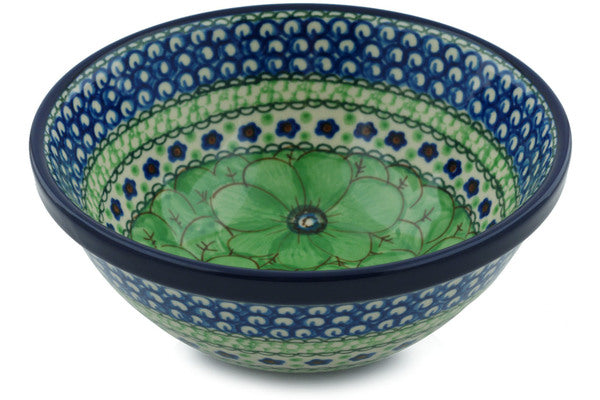 This Green Pansies 6" Bowl was handmade and hand decorated in Boleslawiec, Poland by skilled artisans according to old traditional methods. This is a Polish pottery Signature Unikat, which means that it has been hand painted with both sponges and brushes and it is signed by the artist who painted it. Unikat pieces are the most intricate works of art. Larger Unikat items take hours of very careful work to finish. This Polish stoneware is microwave, dishwasher, freezer, and oven safe up to 480°F. It does not contain lead or cadmium. It is part of the Green Pansies Collection.