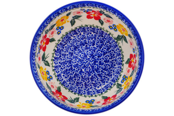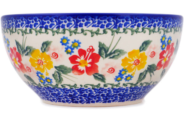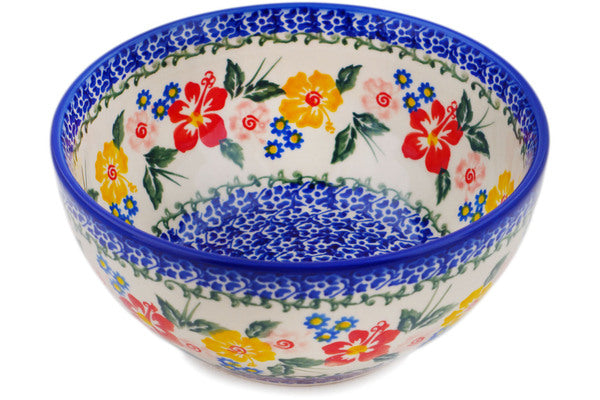 This Hibiscus Haven 6" Bowl was handmade and hand decorated in Boleslawiec, Poland by skilled artisans according to old traditional methods. This Polish stoneware is microwave, dishwasher, freezer, and oven safe up to 480°F. It does not contain lead or cadmium. It is part of the Hibiscus Haven Collection.