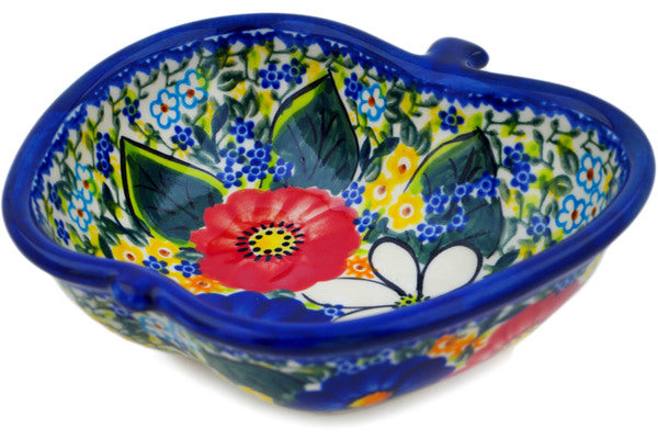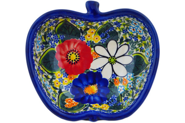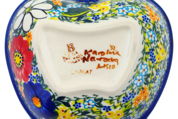 This Magical Spring 6" Apple Shaped Bowl was handmade and hand decorated in Boleslawiec, Poland by skilled artisans according to old traditional methods. This is a Polish pottery Signature Unikat, which means that it has been hand painted with both sponges and brushes and it is signed by the artist who painted it. Unikat pieces are the most intricate works of art. Larger Unikat items take hours of very careful work to finish. This Polish stoneware is microwave, dishwasher, freezer, and oven safe up to 480°F. It does not contain lead or cadmium. It is part of the Magical Spring Collection.