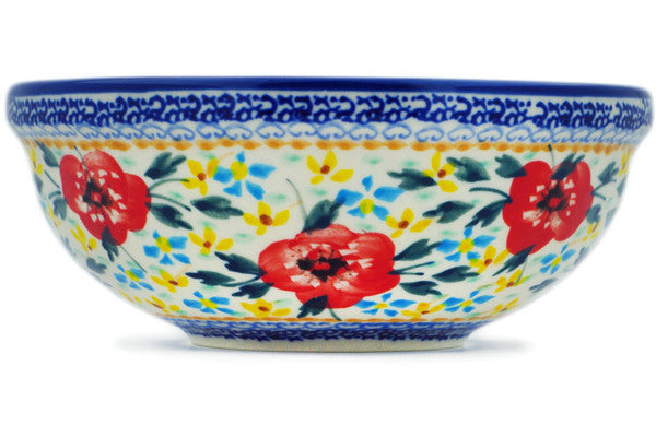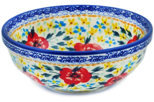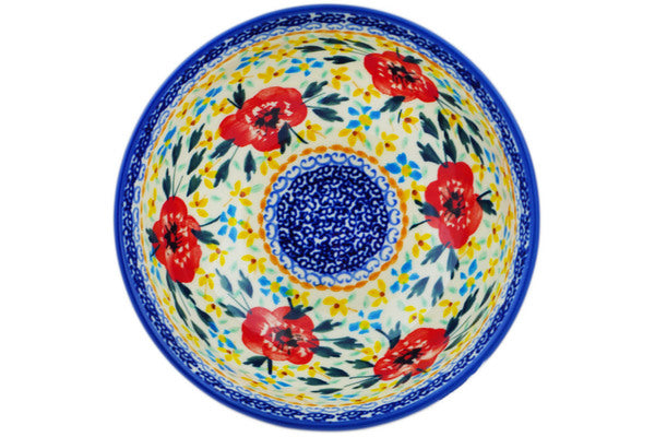 This Rainbow Field 6" Bowl was handmade and hand decorated in Boleslawiec, Poland by skilled artisans according to old traditional methods. This is a Polish pottery Signature Unikat, which means that it has been hand painted with both sponges and brushes and it is signed by the artist who painted it. Unikat pieces are the most intricate works of art. Larger Unikat items take hours of very careful work to finish. This Polish stoneware is microwave, dishwasher, freezer, and oven safe up to 480°F. It does not contain lead or cadmium. It is part of the Rainbow Field Collection.