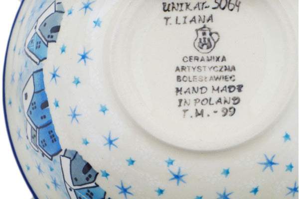 This Snowy Village 6" Bowl was handmade and hand decorated in Boleslawiec, Poland by skilled artisans according to old traditional methods. This is a Polish pottery Signature Unikat, which means that it has been hand painted with both sponges and brushes and it is signed by the artist who painted it. Unikat pieces are the most intricate works of art. Larger Unikat items take hours of very careful work to finish. This Polish stoneware is microwave, dishwasher, freezer, and oven safe up to 480°F. It does not contain lead or cadmium. It is part of the Snowy Village Collection.