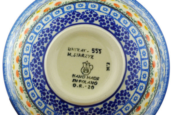 This Winter Forest 6" Bowl was handmade and hand decorated in Boleslawiec, Poland by skilled artisans according to old traditional methods. This is a Polish pottery Signature Unikat, which means that it has been hand painted with both sponges and brushes and it is signed by the artist who painted it. Unikat pieces are the most intricate works of art. Larger Unikat items take hours of very careful work to finish. This Polish stoneware is microwave, dishwasher, freezer, and oven safe up to 480°F. It does not contain lead or cadmium. It is part of the Winter Forest Collection.