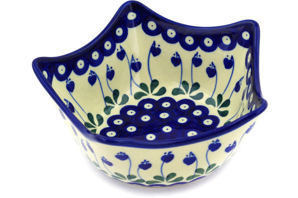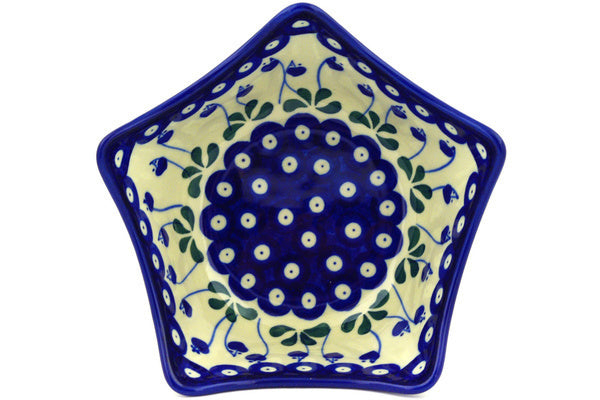 This Bleeding Heart Peacock 7" Star Shaped Bowl was handmade and hand decorated in Boleslawiec, Poland by skilled artisans according to old traditional methods. This Polish stoneware is microwave, dishwasher, freezer, and oven safe up to 480°F. It does not contain lead or cadmium. It is part of the Bleeding Heart Peacock Collection.