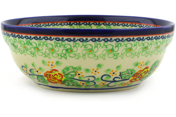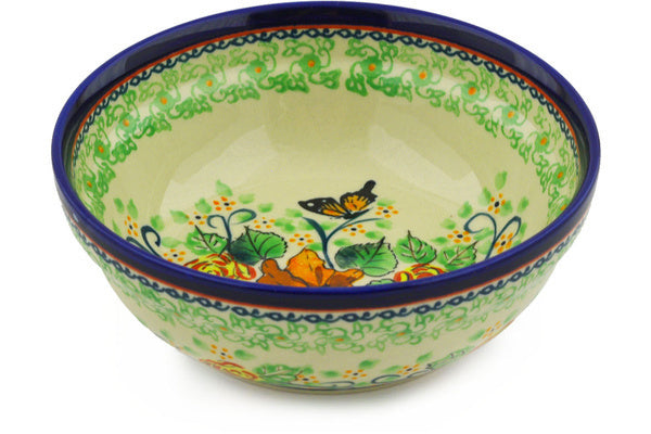 This Butterfly Meadow 7" Bowl was handmade and hand decorated in Boleslawiec, Poland by skilled artisans according to old traditional methods. This is a Polish pottery Signature Unikat, which means that it has been hand painted with both sponges and brushes and it is signed by the artist who painted it. Unikat pieces are the most intricate works of art. Larger Unikat items take hours of very careful work to finish. This Polish stoneware is microwave, dishwasher, freezer, and oven safe up to 480°F. It does not contain lead or cadmium. It is part of the Butterfly Meadow Collection.