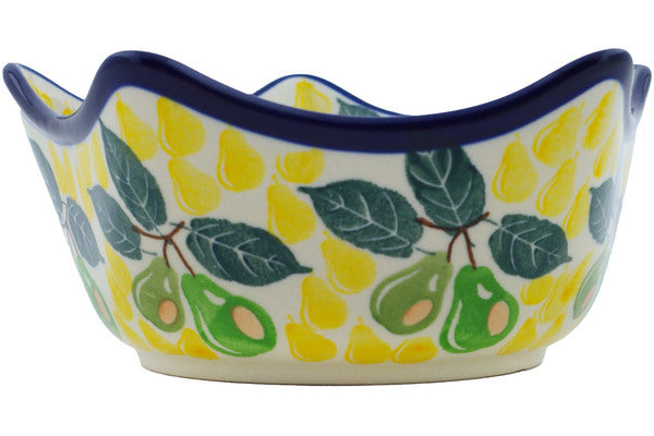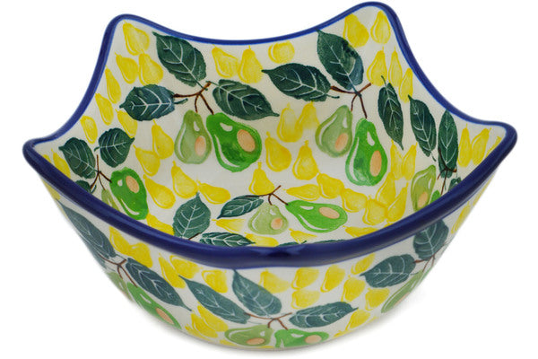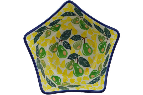 This Fresh Pear 7" Star Shaped Bowl was handmade and hand decorated in Boleslawiec, Poland by skilled artisans according to old traditional methods. This Polish stoneware is microwave, dishwasher, freezer, and oven safe up to 480°F. It does not contain lead or cadmium. It is part of the Fresh Pear Collection.