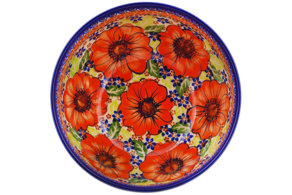 This Orange Zinnia 7" Bowl was handmade and hand decorated in Boleslawiec, Poland by skilled artisans according to old traditional methods. This is a Polish pottery Signature Unikat, which means that it has been hand painted with both sponges and brushes and it is signed by the artist who painted it. Unikat pieces are the most intricate works of art. Larger Unikat items take hours of very careful work to finish. This Polish stoneware is microwave, dishwasher, freezer, and oven safe up to 480°F. It does not contain lead or cadmium. It is part of the Orange Zinnia Collection.