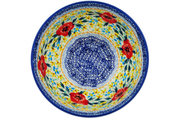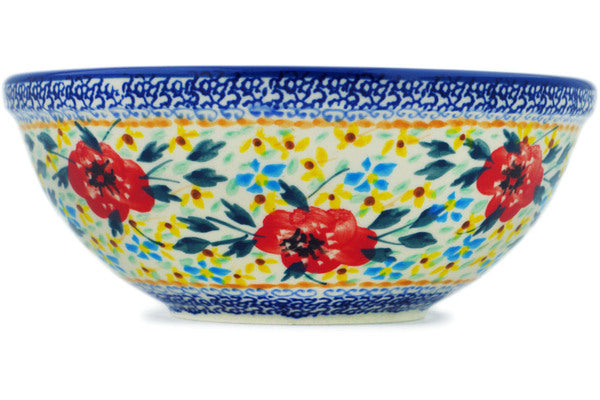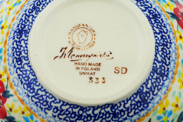 This Rainbow Field 7" Bowl was handmade and hand decorated in Boleslawiec, Poland by skilled artisans according to old traditional methods. This is a Polish pottery Signature Unikat, which means that it has been hand painted with both sponges and brushes and it is signed by the artist who painted it. Unikat pieces are the most intricate works of art. Larger Unikat items take hours of very careful work to finish. This Polish stoneware is microwave, dishwasher, freezer, and oven safe up to 480°F. It does not contain lead or cadmium. It is part of the Rainbow Field Collection.