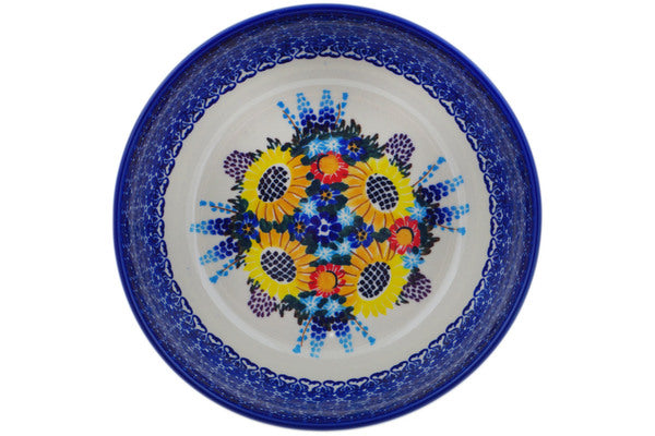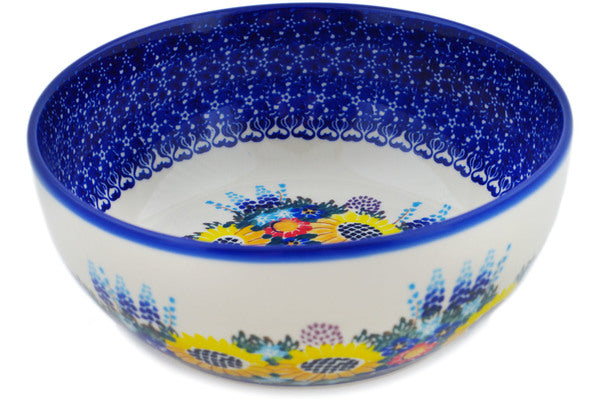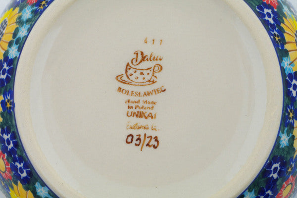 This Sunflower 7" Bowl was handmade and hand decorated in Boleslawiec, Poland by skilled artisans according to old traditional methods. This is a Polish pottery Signature Unikat, which means that it has been hand painted with both sponges and brushes and it is signed by the artist who painted it. Unikat pieces are the most intricate works of art. Larger Unikat items take hours of very careful work to finish. This Polish stoneware is microwave, dishwasher, freezer, and oven safe up to 480°F. It does not contain lead or cadmium. It is part of the Sunflower Collection.